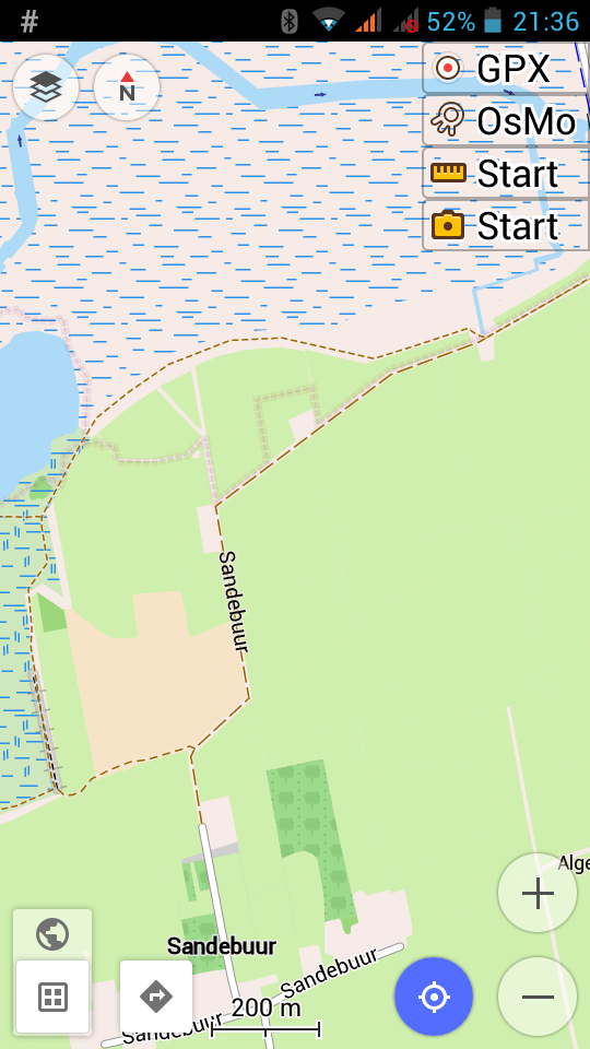 Hoe vind je je weg? Ik gebruik nog steeds graag mijn oude kaartenmap, compleet met kompas en curvimeter. (Die van Recta zijn niet meer te krijgen, maar Suunto en Silva hebben ze nog.) Altijd overzichtelijk, alles bij de hand en geen geklier met batterijen of signalen. Maar ik heb toch ook mijn Android smartphone bij me, bewapend met GPS en de navigatie-app OsmAnd+. Daar is ook een gratis versie van, die prima werkt, maar voor een paar euro kun je meer kaarten downloaden en steun je het project. De basis voor deze app is het kaartenbestand van OpenStreetMap, een open-source community-project. Iedereen kan daar een account aanmaken en daadwerkelijk bijdragen aan het kaartmateriaal. Desgewenst zelfs direct terwijl je onderweg bent. Ik vergelijk lopendeweg de vertrouwde papieren kaart en de nieuwerwetse app.