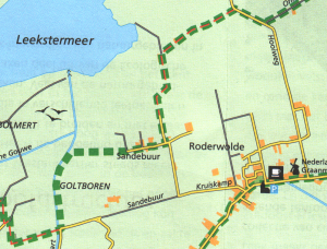 Maar onderweg kom ik onverwachte verrassingen tegen. Zo kun je van het oostelijk einde van Sandebuur echt niet naar de Rodervaart lopen. De aangegeven route is, hoewel op papier gedrukt, geheel virtueel. En de mooie graspaden rond de zuidwest-hoek van het Leekstermeer staan er nou net weer niet op.
