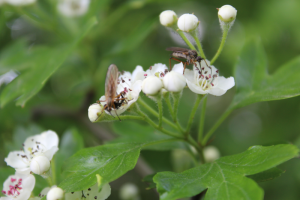 En de bloemetjes en de bijtjes zijn ook altijd mooi. Zelfs als het geen bijtjes zijn maar insecten die ik niet kan benoemen. Want de bloeiende meidoorn geurt bijna bedwelmend. En volgens mij vonden die twee vliegbeestjes dat ook.