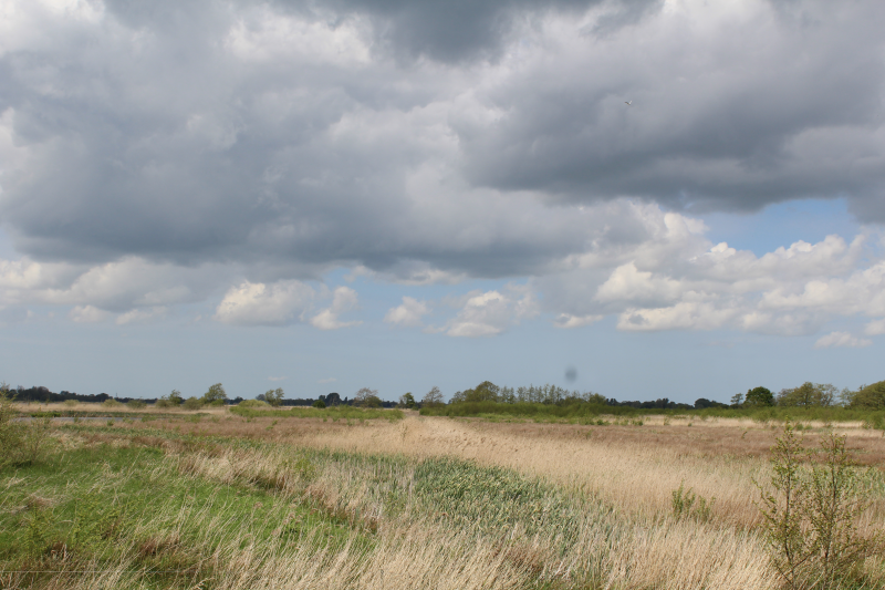 Wat is er nu te zien op zo’n verruigd stukje ‘wetland’? Tegelijk niet veel behalve die prachtige ruimte met wolken, maar toch ook een heel palet aan kleuren. Gewoon er middenin lopen, de vogels horen, de wind voelen en de zon, de kleurverandering als er wolken langsschuiven. Daar gaat je hart van open en je krijgt ruimte in je hoofd. Een foto kan dat niet vangen, maar geeft wellicht een indruk.