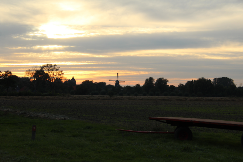 De maandag na de wandeling liepen we de route nog eens met z’n beiden. Iets minder zon, wat meer stilte en ons eigen loopritme. En ook boeren druk aan het werk met uien oogsten, aardappels verwerken, ploegen en eggen. Eigenlijk versterken die activiteiten de rust meer dan dat ze die verstoren. In Eenum werden we bijna opgesloten in de kerk, maar daar kwam een heel leuk gesprek uit voort. Vredig ging de zon onder boven Zeerijp.