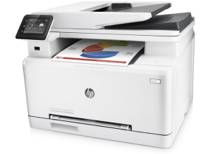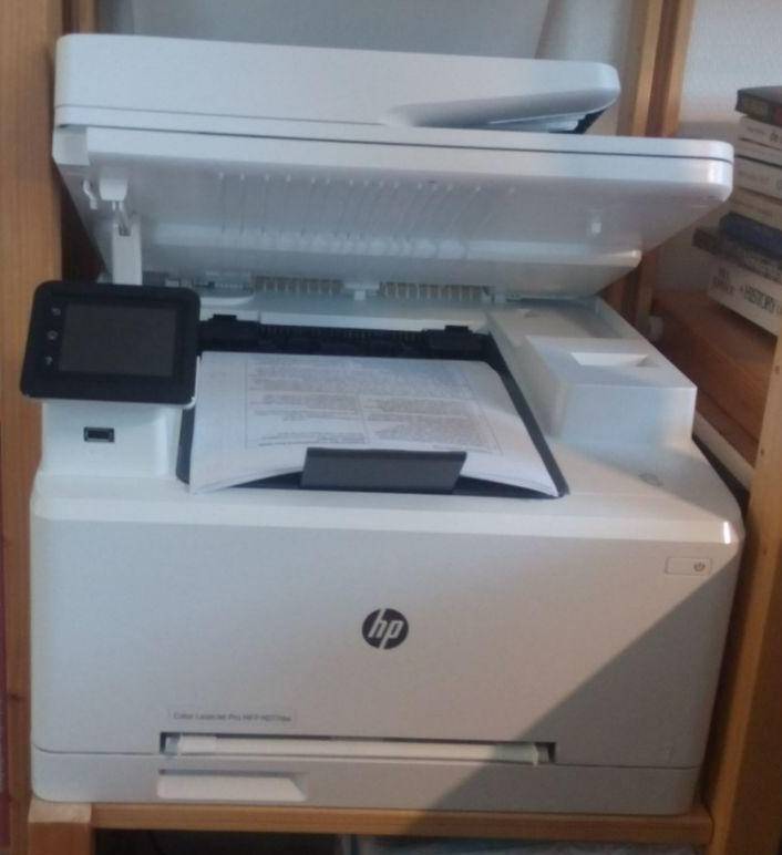 So I returned to good old HP. Right now I am sitting beside a HP LaserJet Pro MFP M277dw All-in-one colour laser printer, scanner and fax. To have a fax part may seem a bit old-fashioned nowadays, but no need to use it. If you do want to use it, you would need a traditional (analogue) telephone connection. The scanner is absolutely fine and it beats the (basic) Canon Lide-100 flatbed scanner I had. Especially it cooperates better with the default Linux scanning software, sane. For the Canon scanner I always had to adjust gamma after scanning, with the HP it is just fine on first scan. Common scanning applications, like XSane, Simple Scan or Skanlite, can be used to operate the scanner from your desktop. The printer too is nice. Faster, more silent than my previous Kyocera, and apart from LAN networking it can also do Wifi. The machine as a whole is surprisingly small and does not break your back when you lift it. Cherry on the cake: this printer comes with a shiny touchscreen panel to operate it – much easier than pushing wee buttons.