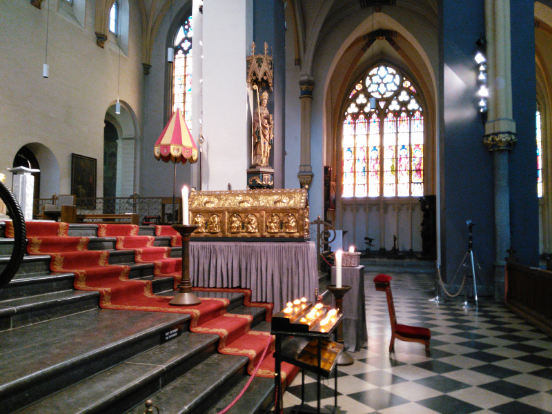 We zijn er op zondag 26 april na de kerkdienst dus maar eens heen gereden. Met 100 over lege snelwegen is op zich al een vorm van stilte zoeken. De grens met België zat op slot, maar Maastricht was bepaald niet uitgestorven. Het was prachtig lenteweer tenslotte. Iedereen hield netjes anderhalve meter afstand. We waren nog net op tijd voor het laatste stukje van de korte viering en in de basiliek was het echt geen probleem om afstand te houden. Letterlijk een handvol mensen, allemaal ouder, zaten verspreid waar plaats was voor honderden. We werden verbonden door wierook en woorden en zongen twee coupletten uit het Sint-Servaaslied voor we met een zegen werden heengezonden. Om beurten mochten we nog even bij de reliekschrijn staan en een kaarsje branden. Dat was het.